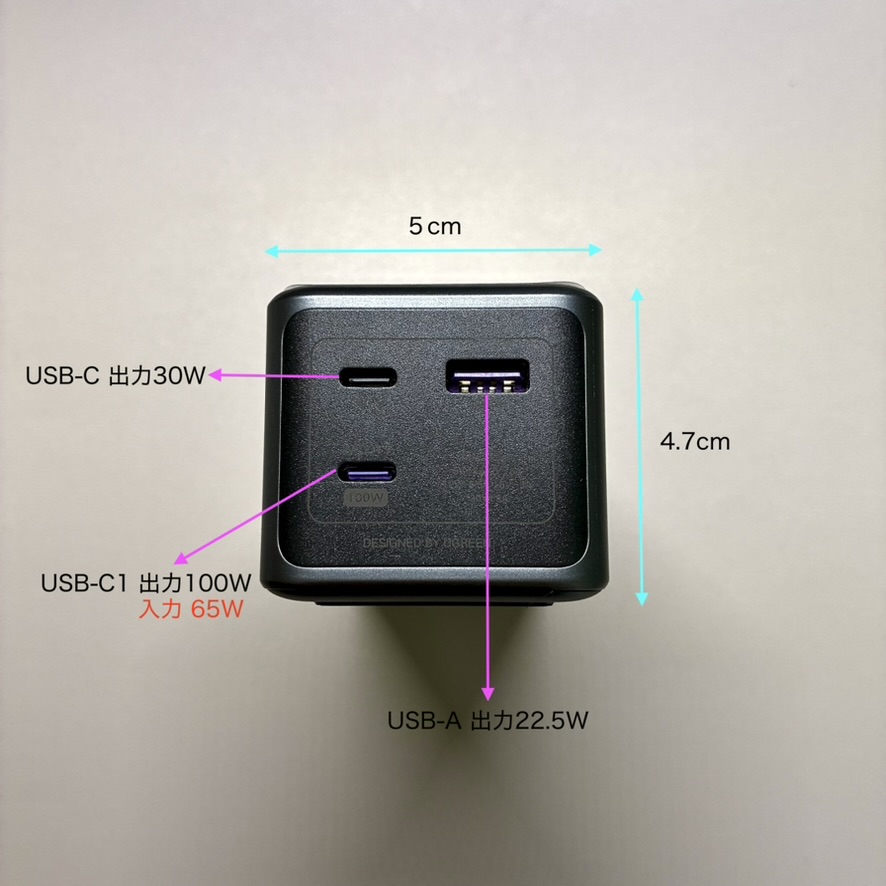 モバイルバッテリーの上部にはタイプCのポート2箇所とタイプAのポートが1箇所あります。給電する場合はC1ポートのみ対応しており最大65Wで給電できます。よこ5cm・たて4.7cm