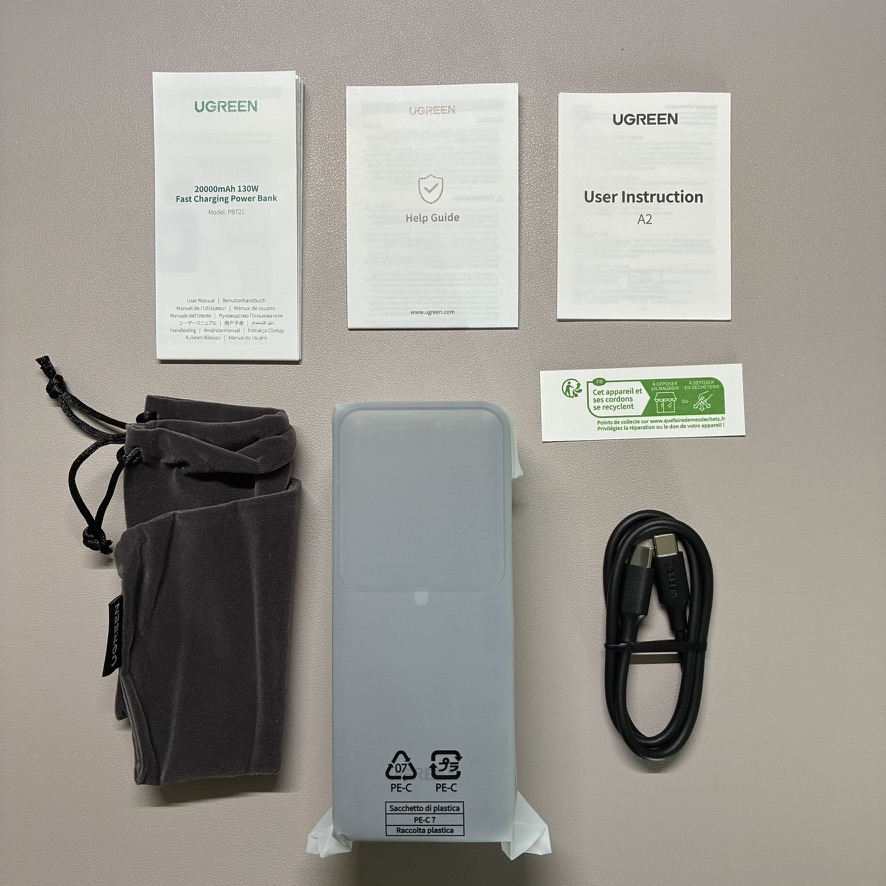 箱を開けるとモバイルバッテリー本体・収納袋・USB-Cケーブル・マニュアル等が入ってます。収納袋付きなのは嬉しいですね。