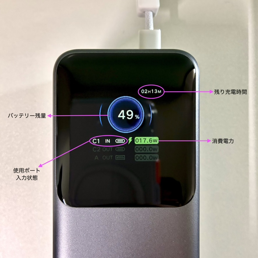 画面上でバッテリー残量・残り充電時間・使用中のポート・消費電力等が確認する事ができます。