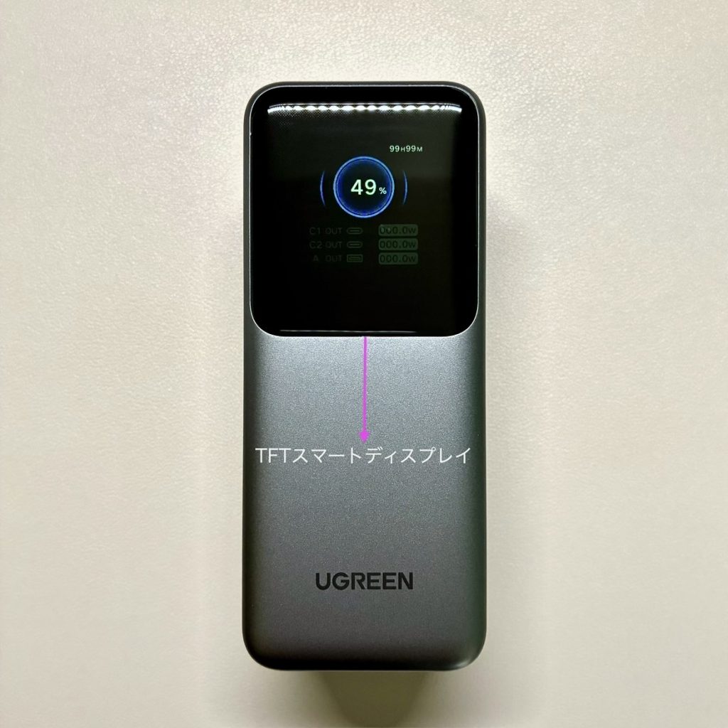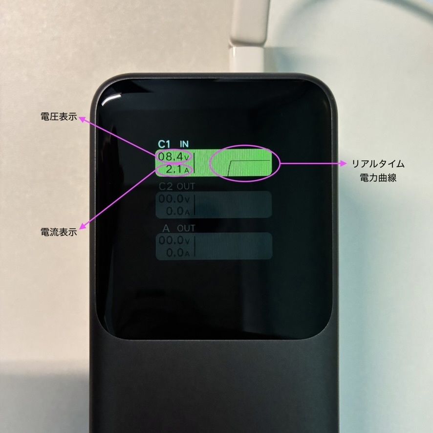 - TFTディスプレイ搭載で充電・給電ワット数が確認できる。