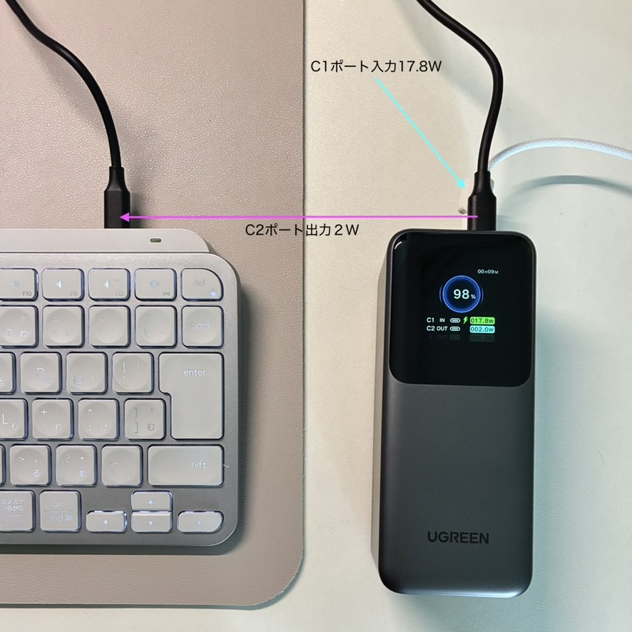 C1ポートで給電しながらC2ポートでキーボードを充電している状態です。給電は17.8Wで充電は2Wで充電されています。※給電は最大65Wですが対応するケーブルと電源アダプタが必要になります。