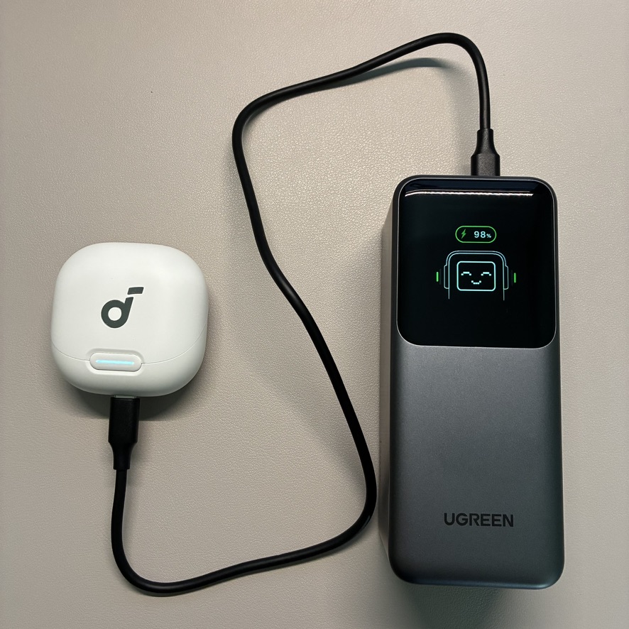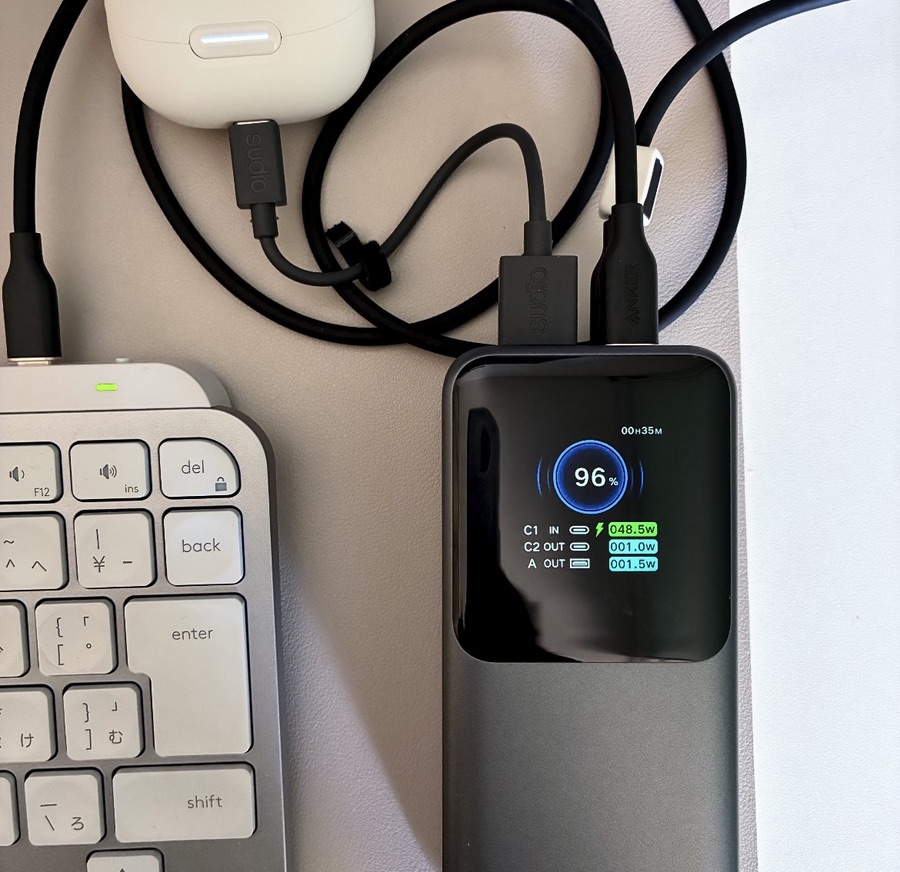 C1ポートで給電しながら、C2ポート(キーボード)・Aポート(ワイヤレスイヤホン)を充電している状態です。給電ポートには60W対応のケーブルと電源アダプタを使用しているので給電ワット数が上がっています。
