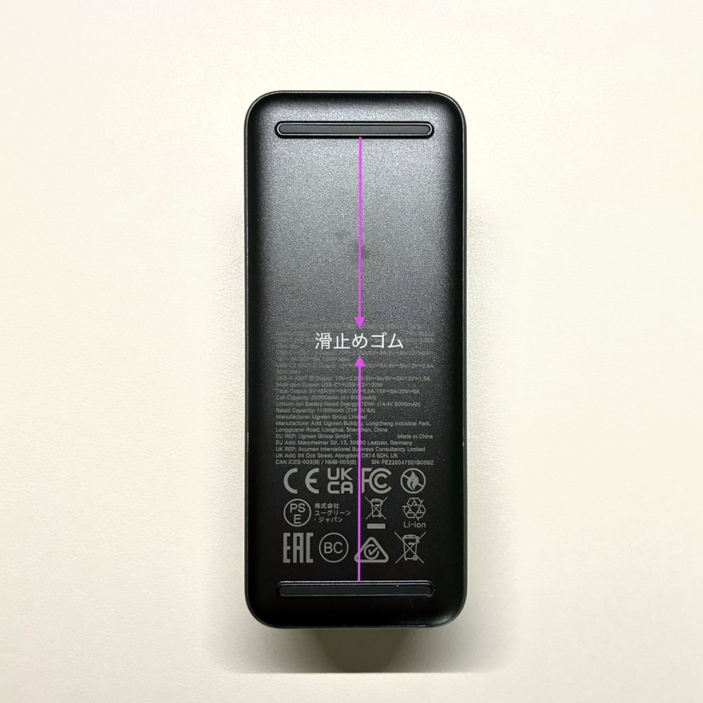 モバイルバッテリー裏面には滑止めゴムが付いているので安心ですね。